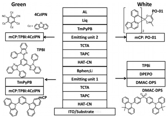 Since blue TADF emitters can produce highly efficient blue emission by harvest both singlet and triplet excitons, such kind of emitters have great potential to develop tandem hybrid WOLEDs [214,215]. Recently, Hung et al. reported the first tandem hybrid WOLED by utilizing blue TADF emitter bis[4-(9,9-dimethyl-9,10-dihydroacridine)phenyl]sulfone (DMAC-DPS) and orange phosphorescent emitter:bis(4-phenylthieno-[3,2-c]pyridine) (acetylacetonate)iridium(III) (PO-01), showing the peak CE of 78.5 cd A−1 and EQE of 28.5% with the CIE coordinates of (0.33, 0.45) at 1000 cd m−2 [216]. The device structure was ITO/HAT-CN (10 nm)/TAPC (40 nm)/TCTA (10 nm)/DMAC-DPS (20 nm)/DPEPO (5 nm)/TPBI (40 nm)/Bphen:Li (1.2 wt.%, 15 nm)/HAT-CN (10 nm)/TAPC (40 nm)/TCTA (10 nm)/mCP:PO-01 (1.4 wt.%, 20 nm)/1,3,5-tri[(3-pyridyl)-phen-3-yl (TmPyPB, 40 nm)/Liq (2 nm)/Al (120 nm), as shown in Figure 10. Prior to the tandem hybrid WOLED, Hung et al. realized an efficient tandem green TADF OLED with the CGL of Bphen:Li/HAT-CN, achieving the EQE of 32.5%. Such results also demonstrated the CGL was effective, which was attributed to the efficient charge generation, excellent optical transparency and good electron transporting properties of Bphen; Li. On the other hand, since both blue TADF emitter and phosphorescent emitter could harvest singlets and triplets in their individual EL unit, high efficiency was attained.