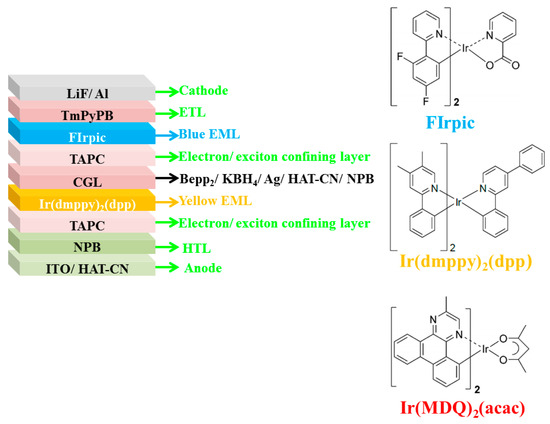 In 2007, Liu et al. demonstrated the doping-free tandem WOLEDs by managing an effective doping-free CGL of Bepp2 (25 nm) /KBH4 (1 nm)/Ag (0.5 nm)/HAT-CN (130 nm)/NPB (15 nm) to interconnect doping-free EMLs and doping-free charge transport layers [224]. The device architecture was ITO/HAT-CN (100 nm)/NPB (15 nm)/TAPC (5 nm)/bis(2-phenyl-4,5-dimethylpyridinato)[2-(biphenyl-3-yl)pyridinato] iridium(III) (Ir(dmppy)2(dpp), 0.6 nm)/CGL/TAPC (5 nm)/FIrpic (0.5 nm)/TmPyPB (50 nm)/LiF (1 nm)/Al (200 nm), where Ir(dmppy)2(dpp) and FIrpic were the yellow and blue emitters (device W1), respectively, as shown in Figure 11. Additionally, by using the red emitter Ir(MDQ)2(acac) to replace Ir(dmppy)2(dpp) as well as optimizing the optical effect, another doping-free tandem WOLED was constructed (device W5). As a result, device W1 could accomplish the simplified structure/short fabrication time/reduced cost/high efficiency (81.2 cd A−1)/low efficiency roll-off/low voltage/high luminance (44,886 cd m−2) trade-off, while device W5 could possess an acceptable CRI of 67. For the high performance, the doping-free CGL was effective to ensure the charge generation and separation. With the combination of KBH4 and Ag to modify the Bepp2/HAT-CN interface, the electron injection was improved, since metallic K was released by the thermal decomposition of KBH4 and the surface of Bepp2 films was not an absolute plane. Hence, a thin K-doping Bepp2 layer at the KBH4/Bepp2 interface was formed. Additionally, Ag functioned as electrodes for both units, also improving electron injection. On the other hand, phosphorescent emitters were adopted in each unit to not only harvest both singlet and triplet excitons but also ensure the white light.