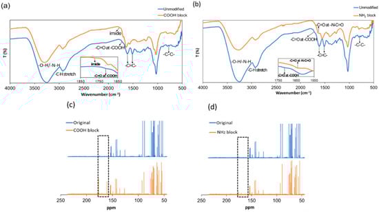 FTIR spectra comparison of the unmodified CNDs, –COOH-blocked CNDs (a), and –NH2-blocked CNDs (b) and 13C NMR spectra comparison of the unmodified CNDs, –COOH-blocked CNDs (c), and –NH2-blocked CNDs (d). Each NMR spectrum is the average of 10,000 scans.