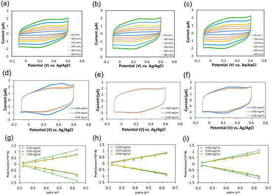 Representative cyclic voltammograms for the DPPH•-gold electrode system reacted with 0.04 mg/mL unmodified (a), –COOH-blocked (b), and –NH2-blocked CNDs (c) at scan rates of 50, 100, 150, 200, 300 and 400 mV/s, respectively; representative comparison of cyclic voltammograms for the DPPH•-gold electrode system reacted with different concentrations of the unmodified (d), –COOH-blocked (e), and –NH2-blocked CNDs (f) at a scan rate of 400 mV/s; representative plots of the linear dependence of the peak current on the voltage scan rate reacted with different concentrations of the unmodified (g), –COOH-blocked (h), and –NH2-blocked CNDs (i).