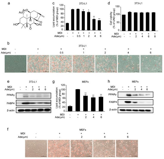 Moreover, we also attempted to confirm the effect of adenanthin in adipogenesis in MEFs, a type of fibroblast isolated from mouse embryos. Consistent with the above results of 3T3-L1 cells, we observed that adenanthin treatments suppressed lipid accumulation (Figure 1f,g). Similarly, adenanthin treatments also strikingly reduced the levels of PPARγ and FABP4 in MEFs (Figure 1h).