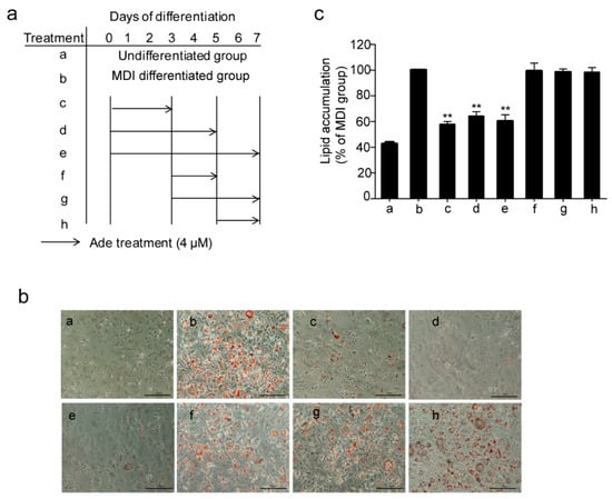 Next, we investigated the mechanism of adenanthin on its inhibition of adipogenesis, we treated the 3T3-L1 preadipocytes with adenanthin and MDI medium together at different stages of differentiation as indicated in Figure 2a. As shown in Figure 2b,c, treatments with adenanthin strikingly decreased lipid accumulations by ~42%, ~36%, and ~40% from day 0 to 3, day 0 to 5, and day 0 to 7, whereas treatments on the other days (3–5, 3–7, and 5–7) did not affect lipid accumulation, indicating that adenanthin suppressed adipogenesis by inhibiting the early stage of adipocyte differentiation.