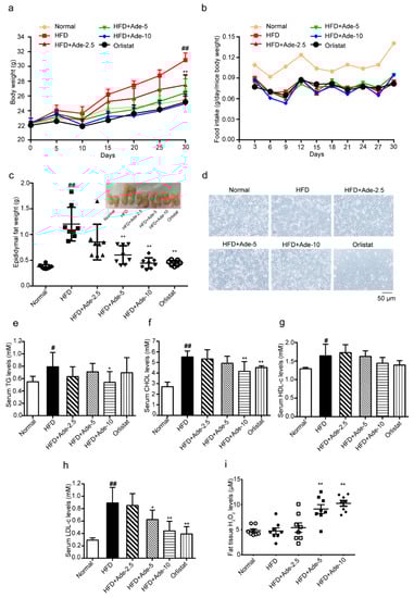 Adenanthin inhibited the development of obesity in high-fat diet (HFD) induced mice. (a) The time-lapse of body weight during 30-day treatments of mice by normal diet or HFD with adenanthin (2.5, 5, or 10 mg/kg/day) or orlistat (60 mg/kg/day). (b) Food intake during the inducing of obesity of mice from (a). (c) Weights of epididymal fat tissue of mice from (a). (d) Representative H&E staining images of epididymal adipose tissue from (a,c). Scale bars, 50 μM. (e–h) Serum TG, CHOL, HDL-c, and LDL-c levels of mice from (a). (i) The H2O2 level of epididymal adipose tissue from mice (a,c). Date are presented as mean ± SD; * p < 0.05, ** p < 0.01 versus HFD-induced group; # p < 0.05, ## p < 0.01 versus normal diet group, n = 8.