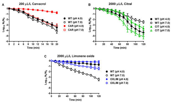 Lethal ICs treatments were carried out in cultures resuspended in 10 mL buffer at both pHs added with 200 μL/L of carvacrol, 2000 μL/L of citral, or 2000 μL/L of (+)-limonene oxide. Treatments were applied at room temperature, except (+)-limonene oxide treatments that were performed at 37 °C. Samples were taken every 2 min up to 20 min at carvacrol treatments and every 10 min up to 120 min at citral and (+)-limonene oxide treatments.