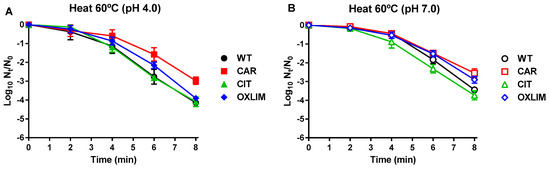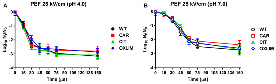 Cross-tolerance of derivative strains against physical food preservation technologies, such as heat and PEF treatments, was also evaluated. Figure 3 shows inactivation of WT and the derivative strains after a heat treatment at 60 °C in a buffer of pH 4.0 (Figure 3A) or 7.0 (Figure 3B). No significant differences were detected among the survival of WT, CIT, and OXLIM after heat treatments at pH 4.0 (Figure 3A). Only CAR showed a significantly higher survival than WT (p ≤ 0.05) under these conditions: while inactivation of CAR after 8 min of heat treatment was approx. 3 log10 units, initial population of WT, CIT, and OXLIM was reduced in approx. 4 log10 units. With regard to heat treatments at pH 7.0, no differences were found between WT and CIT (p > 0.05), with a population reduction of 3.6 log10 units after 8 min (Figure 3B). However, in comparison to WT, an increased survival of CAR and OXLIM after the same treatment was detected (p ≤ 0.05), with 2.5 and 2.9 log10 units of inactivation, respectively.