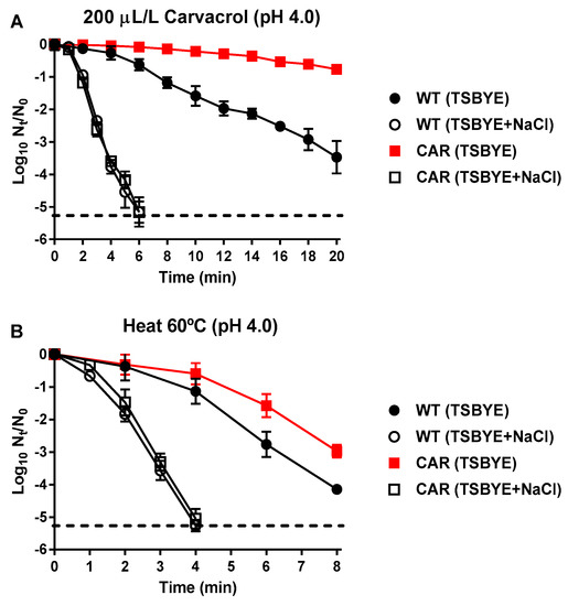 Considering these results on survival to lethal treatments, CAR was shown to be the most tolerant strain. Therefore, this strain was selected to determine the occurrence of sublethal injuries in the cytoplasmic membrane after these treatments, in order to determine whether the increased survival was related to an increased intrinsic cell tolerance or an improved damage-repair system. CAR and WT were treated with carvacrol or heat at pH 4.0 (Figure 5), the pH at which the greater differences in tolerance between both strains were observed. Treated cells were plated in non-selective and selective media with NaCl added. The latter medium would avoid the growth of damaged cells in the cytoplasmic membrane and only permit the growth of intact cells [12]. Results from carvacrol (Figure 5A) and heat (Figure 5B) treatments revealed that although microbial counts were higher for CAR than for WT in the non-selective recovery medium, no significant differences (p > 0.05) were observed when samples were recovered in the selective medium.