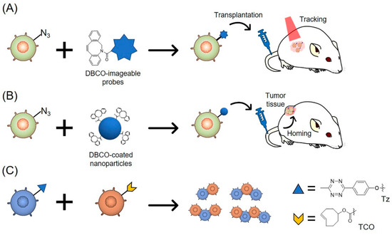 Cell transplantation or cell-based therapy is a powerful therapeutic method for the treatment of various diseases including intractable diseases. Recently, clinical trials of cell-based therapy using stem cells such as mesenchymal stem cells (MSCs) have been conducted [46,47]. However, in most cases, the optimal therapeutic effect of transplanted cells has not been achieved due to low engraftment rates and short survival durations after transplantation [48,49,50]. Recently, many researchers have attempted to improve these therapeutic effects by functionalizing these cells. In addition, the biodistribution and fate of transplanted cells are unclear due to a lack of in vivo cell tracking methods. It is important to understand the biodistribution and biological fate of transplanted cells in order to develop a therapeutic strategy for cell-based therapies. Cell tracking techniques provide information about the in vivo behavior of transplanted cells, including migration, translocation, proliferation, cell death, and differentiation [51,52,53]. Researchers have also attempted to develop a cell tracking method. In this section, we summarize some applications of click chemistry for cell engineering in cell transplantation.