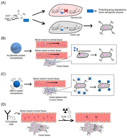 As described above, Ac4ManNAz and its analogs are distributed not only to targeted tumor tissues but also to normal tissues after systemic injection. To achieve tumor-specific labeling with azide groups, researchers have attempted to control the pharmacokinetics of Ac4ManNAz. Here, we describe recent reports regarding the tumor tissue-specific delivery of Ac4ManNAz using nanomaterials (Figure 3B). Lee et al. synthesized Ac4ManNAz-loaded CNPs to improve the accumulation of Ac4ManNAz in tumor tissues [83]. The intravenous injection of Ac4ManNAz-loaded NPs to tumor-bearing mice specifically introduced azide groups into tumor tissues. Furthermore, the expression levels of azide groups in tumor tissues after injection of Ac4ManNAz-loaded CNPs were about 2-fold higher than those of Ac4ManNAz solution-treated groups. This is because most nanoparticles, including Ac4ManNAz-loaded CNPs, accumulate easily in tumor tissues as a result of the EPR effect. This study showed that intravenous injection of Ac4ManNAz-CNPs effectively and specifically generated azide groups in tumor tissues. Xie et al. also demonstrated that azide sugar-loaded folate-modified liposomes were useful for labeling cell-surface glycans of folate receptor-overexpressing cancer cells with azide groups [107]. Folate receptors are overexpressed in various cancer cells and have been widely used as target molecules for drug delivery in cancer therapy [108]. In this study, azide sugar-loaded folate modified-liposomes were effectively taken up by folate receptor-overexpressing HeLa cells via endocytosis, and could deliver sufficient amounts of azide sugars into the cytosol to introduce azide groups onto the surface of HeLa cells. Du et al. also demonstrated that Ac4ManNAz-loaded lipid nanomicelles generated azide groups into tumor tissues [43]. Moreover, Lee et al. developed nano-sized metabolic precursors (Nano-MPs) with a combined structure of generation 4 poly(amidoamine) dendrimer back bone and triacetylated N-azidoacetyl-d-mannosamine. The intravenous injection of Nano-MPs in tumor-bearing mice showed the localization of azide groups in tumor tissues, indicating that Ac4ManNAz was specifically delivered to tumor tissues within which azide groups were successfully generated [37]. As such, nano-sized carriers loaded or conjugated with Ac4ManNAz have been demonstrated to introduce sufficient amounts of azide groups into tumor cells to improve the accumulation of click chemistry chemical-drug conjugates. This method could be useful to specifically generate bioorthogonal chemical receptors in tumor tissue.