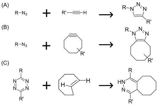 Reaction schemes of various click chemistry reactions. (A) CuAAC reaction with azide and linear alkyne; (B) SPAAC reaction with azide and cyclooctyne; (C) iEDDA reaction with Tz and TCO.
