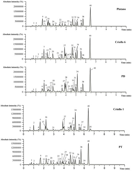 Comparison of UPLC-ESI-Q/TOF-MS2 compounds profile of the extracts prepared from Persea americana Mill. var. drymifolia cultivars. The identification of the peaks is presented in Table 2.