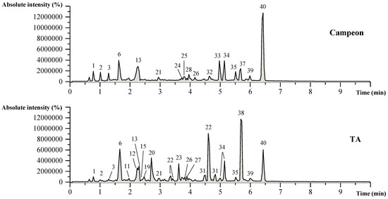 In addition, four unknown compounds were found with deprotonated molecular ions at m/z 375.1574, 413.2761, 401.1310, and 551.2495, which displayed MS2 spectrum fragments at m/z 241.1546, 175.1897, 269.0166, and 505.2192 (Peak 2 = all cultivars; Peak 12 = Criollo 6, and TA cultivars; Peak 24 = Campeon cultivar; Peak 25 = PT, and Campeon cultivars) respectively, but their identity could not be established, since to the best of our knowledge, this is the first time that they have been reported in other plant samples.