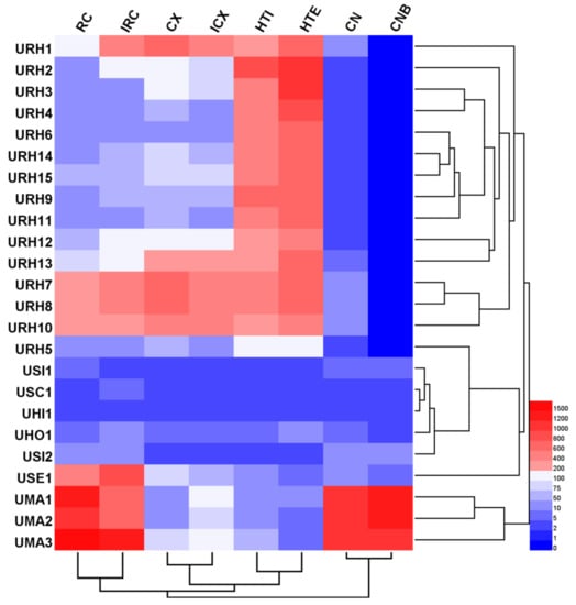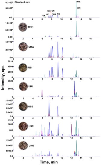 In terms of individual constituents, there were large variations in the contents of these targeted alkaloids in the Uncaria samples according to the species and different origin areas. RC (10.6–232.6 mg/kg), IRC (27.7–455.4 mg/kg), CX (27.5–728.0 mg/kg), ICX (18.8–551.4 mg/kg), HTI (146.9–945.7 mg/kg) and HTE (145.2–1156.3 mg/kg), are abundant, but CNB is not detected and CN is low, even at trace levels in the URH samples. As the species with the highest alkaloids content, RC, IRC, CN and CNB are abundant in UMA (1144.0–1612.0 mg/kg for RC, 623.9–1299.4 mg/kg for IRC, 1057.6–1088.4 mg/kg for CN, and 1033.5–1332.6 mg/kg for CNB). For the species of USI, UHO, USC and UHI, the contents of each targeted alkaloid is low even trace. According to the 100% stacked bar graphs (Figure S2), we can see that HTI and HTE are the main components and their contents account for 32–94% in total content of all targeted alkaloids in the URH samples. Among the remaining six species, the RC and IRC are the main components and they contents account for 41–88% in total contents of targeted alkaloids, especially in USE, the proportion reached 88%.