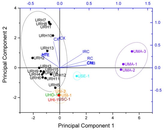 Principal component analysis (PCA) is a multivariate method and widely used in data analysis to summarize variation, which is implemented as a data-reduction technique to generate a visual scatter plot for the qualitative evaluation of resemblances and differences between the studied samples [19]. In order to amplify the difference in the samples and easily discriminate the samples, the PCA was carried out based on the contents of targeted alkaloids, which consisted of a matrix of 8 × 24, with each row containing the content values of targeted alkaloids and each column representing a sample. Then, the variables were centered and scaled to “Unit Variance” before performing the PCA, the results show that the first two principal components (PC1/PC2) explained 81.7% of the total variance. According to the scores plot of PCA, all samples were divided into four groups according to the content values of targeted alkaloids (as shown in Figure 4). Group 1 contained 15 samples (URH1–URH15) belonging to URH species. Group 2 contained three samples (UMA1–UMA3) belonging to UMA. Group 3 contained five samples belonging to USI, UHO, USC and UHI. Group 4 contained one sample belonging to USE. It suggested that they were associated with similar internal quality in same group. The loading plot of PCA based on the targeted alkaloids showed that the HTI and THE contributed most to URH, followed by CX and ICX. While RC, IRC, CN and CNB contributed most to UMA. The classification results of PCA adequately showed the noticeable species, geographical and chemical differences among the samples. The results obtained from PCA based on targeted alkaloids of Uncaria samples were in accordance with that of HCA.