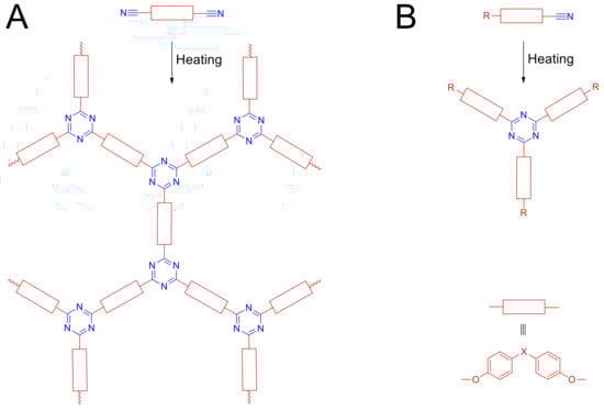 Schemes of polycyclotrimerization of dicyanate esters (A) and cyclotrimerization of monocyanate esters (B).