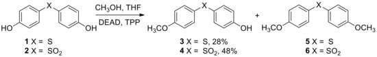 We decided to use well known Mitsunobu synthesis [8] to obtain mono-O-methylated derivatives of bisphenols 1 and 2 (Figure 2). This synthetic approach allows esterification to proceed fast and in very mild conditions.