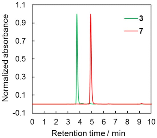 Since the reaction of aryl cyanates polymerization is sensitive to nucleophilic compounds [11,12,13,14], as with residual phenols, the purity of the obtained aryl cyanate 7 was a concern. We evaluated purity of that compound by HPLC. Figure 4 shows chromatograms for compound 7 monomer and parental phenol 3. The retention times for compounds 3 and 7 were 3.75 and 4.91 min subsequently.