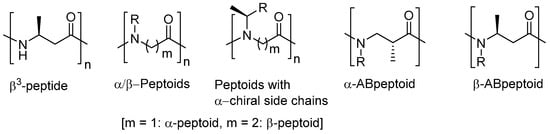 General structures of β3-peptides, α- and β-peptoids, α- and β-peptoids with α-chiral side chains, α-ABpeptoids and β-ABpeptoids.