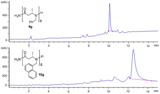 HPLC chromatograms of crude β-ABpeptoid oligomers 9g and 10g.