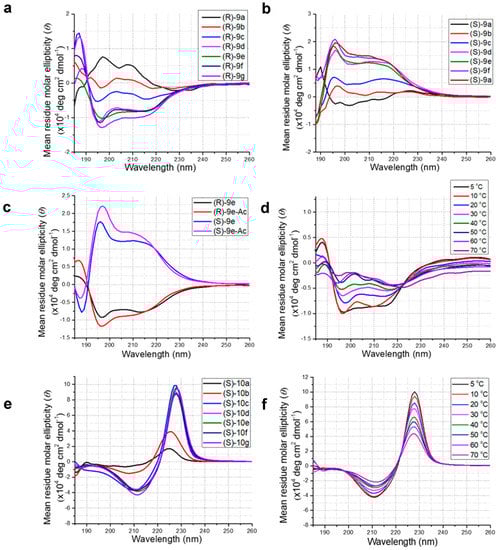To assess the solvent effects on the conformations of oligomers, CD spectra were recorded of oligomers of (S)-9a–g in various polar solvents such as phosphate-buffered saline (PBS) buffer-ACN (1:3), MeOH, and trifluoroethanol (TFE) (Supplementary Information Figures S5 and S6). The oligomers maintain similar CD spectral shapes in PBS buffer-ACN (1:3) solvents, however, in MeOH and TFE solvents, the peaks are intensified and the overall spectral shapes are broadened, suggesting that the formation of conformation could be a result of steric interactions between side chains that may alter in a solvent dependent manner, as demonstrated in N-benzylated peptoids with α-chiral side chains [39,50]. Next, we investigated the temperature dependence of the ordered structure. The CD spectrum of hexamer (R)-9e was measured at different fixed temperatures ranging from 5 to 70 °C (Figure 3d). We found that signal intensity was gradually decreased upon heating, indicating the temperature-dependent denaturation of the folded structure. The thermal denaturation behavior was similarly observed for previously reported β-peptoids, which had stable helical conformations [41].