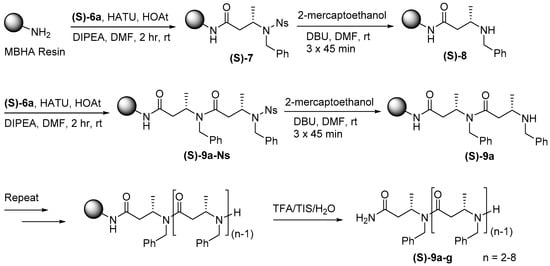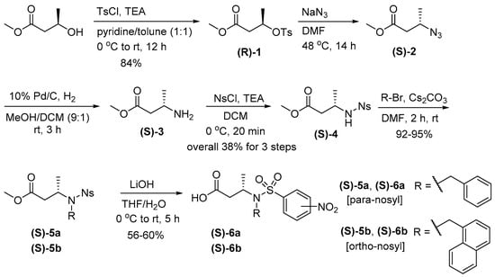 As demonstrated in α-ABpeptoids, we envisioned that the introduction of chiral methyl groups at the backbone β-positions would also influence the structural conformation of peptoids. To explore this, we synthesized a series of β-ABpeptoid oligomers using a facile solid-phase synthetic method. Initially, we prepared β3-homoalanines substituted with benzyl or naphthyl group as monomer building blocks because it is known that aromatic side chains such as N-benzyl and N-naphthyl groups in peptoids with chiral side chains play a critical role in forming ordered structures (Scheme 1) [41,42,43,44,45]. (R)-methyl 3-hydroxy-3-methylpropanoate, a commercially available and inexpensive starting material, was tosylated to give (R)-1 in 84% yield. The tosyl group of (R)-1 was then replaced with the azide group by treatment with sodium azide to produce azide (S)-2 with an inversion of configuration. The resulting azide (S)-2 was reduced to obtain (S)-3, which was then nosylated to afford (S)-4. N-Alkylation was performed by treatment with benzyl bromide or naphthyl bromide in the presence of cesium carbonate and N,N-dimethylformamide (DMF) at room temperature (rt), providing (S)-5 in 92–95% yields. Finally, hydrolysis with lithium hydroxide gave N-alkylated nosyl-protected (S)-6. N-Benzylated monomer with opposite chirality (R)-6a was also prepared using the same procedure starting with (S)-methyl 3-hydroxy-3-methylpropanoate (Scheme 1). This synthetic route was highly efficient, yielding the desired monomer building blocks in enantiomerically pure forms without significant racemization as determined by comparing their optical rotation (Table S1). In addition, the enantiomeric purity was further confirmed by using chiral HPLC (Supplementary Information Figure S1). The enantiomeric excess (ee) for (R)-6 and (S)-6 was 94% and 85%, respectively, showing the synthetic efficiency.
