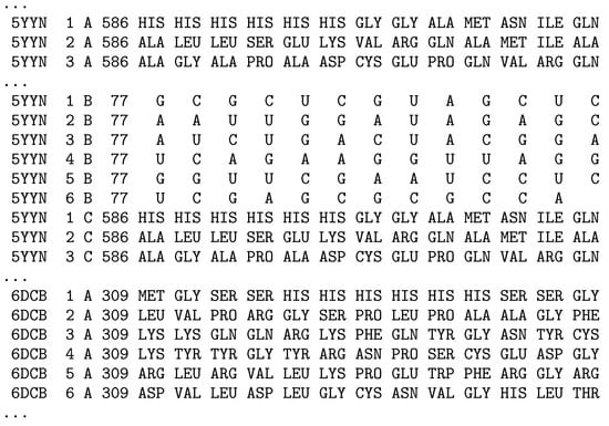 - Westbrook, J.; Fitzgerald, P. The PDB format, mmCIF, and other data formats. Methods Biochem. Anal. 2003, 44, 161–179. [Google Scholar] [PubMed]