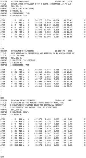 - ATOM that presents the atomic coordinates for standard amino acids and nucleotides. It also presents the occupancy and temperature factor for each atom.