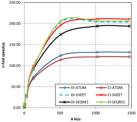 As can be observed in Table 1 the execution time gradually decreases with the number of AUs (increasing parallelization factor). The execution time consists of the extraction time, the time needed for aggregating data from parallel streams, and the time of storing results. For a single AU, it takes more than 3 hours to extract appropriate sections and store extracted data in a new CSV file. The execution time is much better for 32 AUs—the extraction, aggregation, and storing data takes between 6 and 8 min (391 s to 459 s, depending on the section and compression used). For 1024 AUs the process takes less than 2 min (e.g., 97 s for the CI-ATOM). Extraction of the ATOM sections takes more time than the extraction from other sections. This is due to the larger amount of data that must be extracted, aggregated, and finally, stored after the extraction. Generally, the extraction phase is parallelized better than aggregating and storing data. Therefore, speedup gains are not huge for the increasing number of used AUs. Shapes of the n-fold speedup curves can be observed in Figure 5.