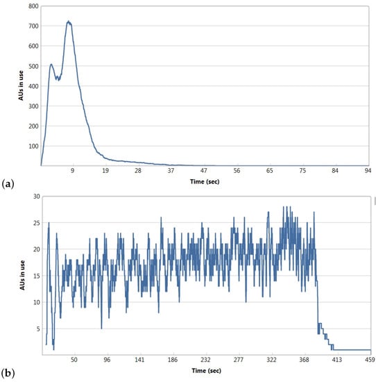 Use of compute resources (AUs) during the whole extraction process on data set DS1 for (a) 1024 AUs, and (b) 32 AUs assigned to the execution.