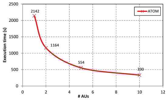 Results of the execution of the whole extraction from the ATOM section of PDB files stored in sequential files for the varying number of allocation units (AUs) is presented in Figure 7. As can be observed the best execution time was achieved when extracting atomic data from 10 sequential files storing approximately 10% of the Protein Data Bank content with the use of 10 AUs—the process took only 330 s.