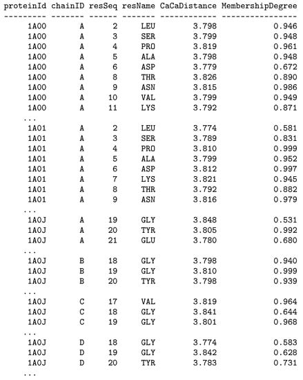 Such a U-SQL code generates the report shown in Figure 9, which is saved to CSV files in the Azure cloud storage by executing the OUTPUT statements in lines 65–67. This report shows residues with values of the – distance around 3.81Å accompanied by membership degrees, which constitute degrees of truth how the particular distance value matches the fuzzy selection condition.