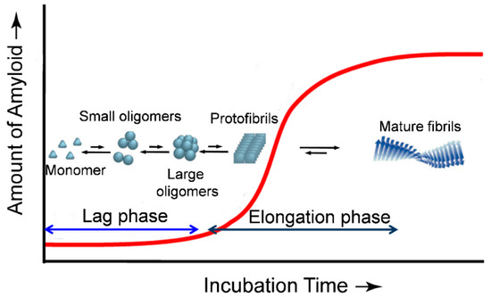 Schematic representation of a typical nucleated polymerization process of protein aggregation. Oligomeric nuclei are formed in the early lag phase stage, being a critical rate limiting step. In an elongation phase, addition of monomers and/or oligomers onto the nucleus allows formation of fibrils which is energetically favorable.