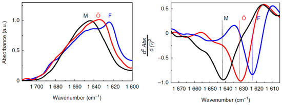 Left panel: normalized FTIR spectra of Aβ1–40 monomers (M) in 10 mM HEPES/D2O pD11, fibrils (F) after 24 h incubation in 10 mM HEPES pD7.4, and Cu(II)-induced oligomers (Aβ1–40-Cu(II)Õ) after 24 h incubation at 37 °C, pD7.4 [51]. Right panel: second derivatives of the FTIR spectra. Reprinted with permission.