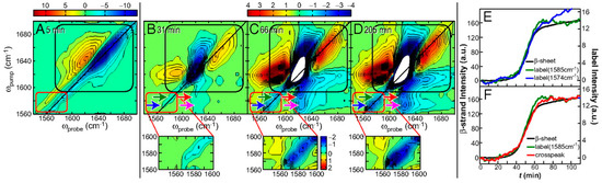 2D-IR spectra and kinetics curves of human IAPP with 13C=18O labeled at the Ala25 residue [113]. (A) The first 2D-IR spectrum at t = 5 min. (B–D) Difference 2D-IR spectra at t = 31, 66, and 205 min, calculated by subtracting the t = 5 min spectrum. Black boxes surround the spectral features of the unlabeled portion of the peptide, whereas red boxes enclose the diagonal peaks of the isotope labeled Ala25. Blue and green arrows highlight the 2 labeled features, whereas magenta and red arrows point to the cross-peak between the 13C=18O Ala25 and the unlabeled β-sheet. (E) Kinetics of the diagonal peaks of the unlabeled β-sheet at 1617 cm−1 and the 2 label features (blue and green arrows). (F) Comparison of the kinetics of the cross-peak and the diagonal peaks. Reprinted with permission.