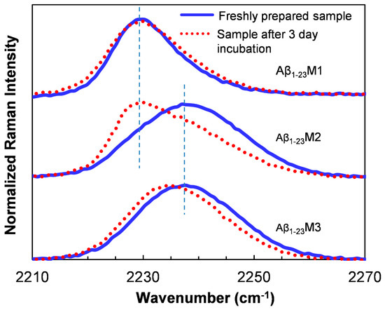 Raman spectra of three Aβ1–23 mutants before and after being incubated for 3 day for aggregation [172]. In the mutants, the PheCN residue was used to replace Tyr10 (Aβ1–23M1), Phe19 (Aβ1–23M2), and Phe20 (Aβ1–23M3), respectively. The vertical dashed lines indicate Raman wavenumbers at 2229 and 2237 cm−1, respectively. Reprinted with permission.