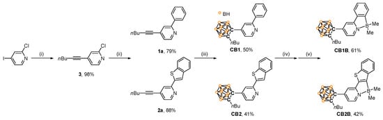 The synthetic pathways for all compounds with an o-carboranyl unit appended at the C4 position of the pyridine ring (CB1, CB1B, CB2, and CB2B) are illustrated in Figure 1. The Sonogashira reaction between 1-hexyne and 2-chloro-4-iodopyridine produces 3 in high yield (98%). After the Suzuki–Miyaura coupling reaction between 3 and phenylboronic acid (for 1a) or benzo[b]thien-2-yl-boronic acid (for 2a), CB1 and CB2 are synthesized via cage formation with decaborane (B10H14) in the presence of Et2S (Scheme 1) [58,63,64,65]. The C∧N-chelated compounds CB1B and CB2B were finally obtained in moderate yield (61% and 42%, respectively) via simple borylation of CB1 and CB2, respectively, with BBr3, followed by treatment with AlMe3.