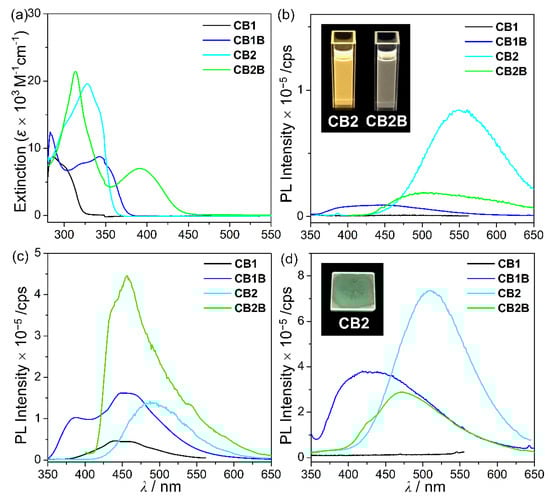 Interestingly, the PL spectrum of CB2 in the film state (Figure 3d inset) shows a Φem nearly twice enhanced (25%) as that in solution at 298 K; however, the Φem values of CB1 in the solution and film states are similar. The emission band mainly involves ICT transition between o-carborane and aryl groups (see the calculated data below). The rigidity of both compounds can inhibit structural fluctuation, although the considerable difference between their emissive properties strongly reveal that maintaining the planarity of the aryl rings promotes radiative decay [58]. Consequently, the kr of CB2 in the film state (1.04 × 109 s−1) is 50 times higher than that in solution (2.20 × 107 s−1) at 298 K (Table 1).