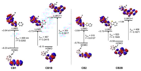 To elucidate the nature of the electronic transitions in the o-carboranyl compounds, TD-DFT optimization of the S0 and S1 structures of CB1, CB2, CB1B, and CB2B were carried out using the B3LYP functional (Figure 4 and Figure S11, Table 3 and Table S3). The calculated geometries were optimized from the X-ray crystal structures of CB2 and CB2B. To include the effects of the toluene solvent [60,61], a conductor-like polarizable continuum model was also used. The computational data for the S0 state show that the lowest-energy electronic transition for the non-chelated compounds (CB1 and CB2) is the highest occupied molecular orbital (HOMO) → lowest unoccupied molecular orbital (LUMO) transition (Figure S11 and Table S3). The HOMOs of both compounds are entirely localized on the aryl moiety (>99%, Tables S5 and S9), whereas the orbital contribution of the o-carborane unit to the LUMOs is slightly higher at >17%. These results indicate that the lowest energy absorption of CB1 and CB2 can be mainly attributed to π-π * transition in the aryl moieties, with a minor contribution from ICT transition between the o-carborane and aryl groups. On the other hand, the calculated data for the optimized S0 geometries of the chelated compounds (CB1B and CB2B) show that the lowest energy absorption mainly involves the two major transitions (fcalc > 0.12, Figure S11 and Table S3) from the HOMO to LUMO and LUMO + 1. The HOMO and LUMO + 1 levels of both compounds are predominantly localized over the BMe2-chelated aryl rings (>96%, Tables S7 and S11 in Supplementary Materials), whereas the LUMO is distributed over not only the aryl rings (∼84%), but also the o-carborane moiety (∼16%). These results suggest that the absorption spectra of CB1B and CB2B can be largely attributed to π-π * transition on the chelated aryl ring, with substantial contribution from the ICT transition associated with the o-carborane moiety, as in the non-chelated compounds. In addition, all calculated data for the optimized S0 structures match the experimental UV-vis absorption spectra well.