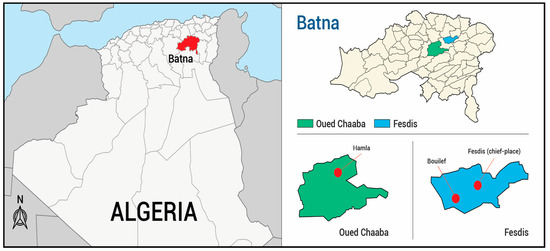 Aerial parts of Santolina africana were collected during the flowering period in May 2016 in three locations in the Batna province (Eastern Algeria): Fesdis (Fesdis: F1–6; Bouilef: B1–6) and Oued Chaaba (Hamla: H1–6) (Figure 1). Identification of the plant material was performed by Dr. Babali B., (Laboratory of Ecology and Management of Natural Ecosystems, University of Tlemcen, Imama Tlemcen, Algeria). A voucher specimen has been deposited at the Laboratory of Natural Products (Department of Biology, University of Tlemcen, Algeria), under the accession n° A. 2844. The essential oil was obtained by hydrodistillation of dried aerial parts (around 150–280 g) for 2 h. Yields have been calculated from dry material.