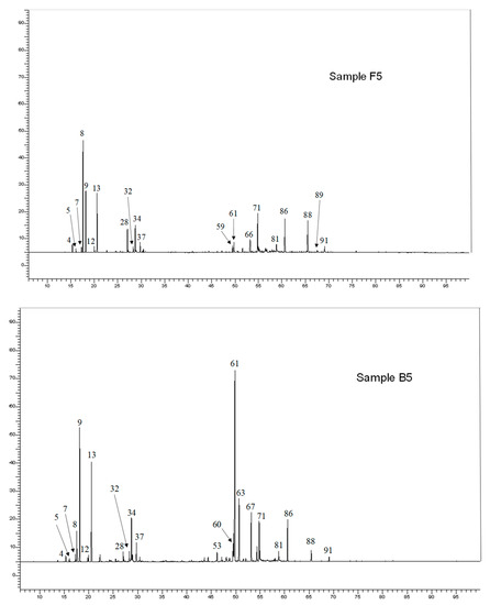 Gas chromatograms of Santolina africana EO (samples F5 up and B5 down). The numbered peaks are the identified components (see Table S1).