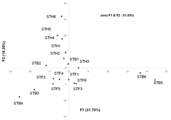 The 18 samples were submitted to statistical analyses: the principal components analysis (PCA, covariance) (Figure 3, Table S1), in which the plan defined by the two axes F1 and F2 described 51.05% of the total variance of the population (the two axes F1 and F2 accounted for 31.70% and 19.35%. respectively). It may be noted that the composition of all samples was qualitatively quite similar. Although the compositions of the individual samples varied substantially for various components, it was not possible to distinguish groups within the essential oil samples. Therefore, one main group (16 samples) and differentiated two atypical compositions (B5 and B6, Figure 3) were observed. Indeed, B5 and B6 were discriminated by a high percentage of sesquiterpene hydrocarbons (bicyclogermacrene, (E)-α-bisabolene, γ-curcumene) and particularly germacrene D, 25.3% (B5) and 20.2% (B6) vs. 0–7.5% for the other samples. All the samples from the Fesdis location were homogeneous, while the composition of the samples from the Hamla location appeared much less homogeneous. Conversely, it appeared that the Bouilef samples, located between the two others locations (Fesdis and Hamla) were different, so two samples (B3 and B4) were aggregated to those of the Fesdis location, whereas the two samples B1 and B2 were quite similar to the Hamla samples (Figure 3).