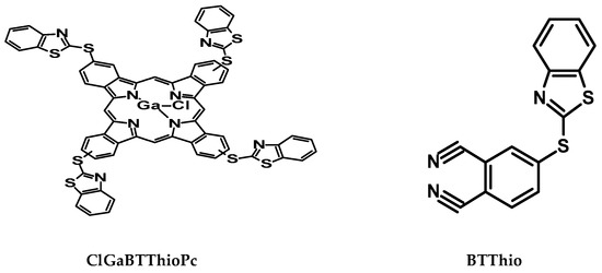 Phthalocyanines (Pcs) possess planar π-conjugated conformations [17], a property which enhances their ability to adsorb onto the metal surface and hence have been exploited for corrosion inhibition purposes [18,19,20,21]. This work reports on the corrosion inhibition of the phthalocyanine substituted with benzothiazole (BTThio) when compared to the latter alone. The Pc employed is tetrakis[(benzo[d]thiazol-2ylthio)phthalocyaninato]gallium(III)chloride (ClGaBTThioPc) (Figure 1). BTThio was involved in the synthesis of ClGaBTThioPc, therefore, it is expected that corrosion inhibition would be enhanced in the latter due to the π-conjugated electron rich Pc to which benzothiazole containing N and S in their structures are substituted. The presence of Ga(III) as a central metal allows for an attachment of an axial ligand, which is expected to reduce the aggregation of MPcs. Aggregation limits the application of MPcs in corrosion inhibition [19].
