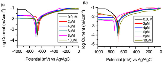 Potentiodynamic polarization curves for aluminum in 1.0 M hydrochloric acid in the absence and presence of (a) BTThio and (b) ClGaBTThioPc at 28 °C.
