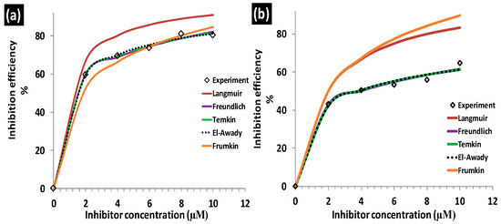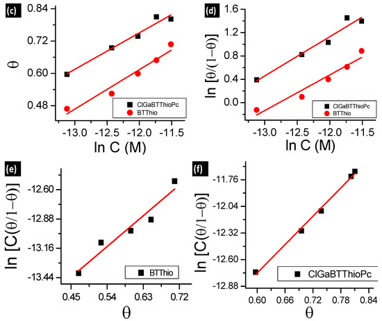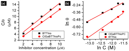 Langmuir adsorption isotherm was derived based on the assumption that the adsorption surface possesses sites with equivalent/similar energies of adsorption, allowing maximum/saturated adsorption of solute molecules for adsorbent monolayer coverage [33]. It implies that molecules following Langmuir adsorption mechanism should have slope value of unity as predicted by Equation (S2). The linear form of Langmuir adsorption isotherm used herein (see supporting information for Equation (S2)) has C as the inhibitor concentration, θ is surface coverage (θ = IE%/100) [7] and KL is the adsorption equilibrium constant obtained from Langmuir isotherm. Values of regression coefficient (R2) 0.9871 for BTThio and 0.9971 for ClGaBTThioPc were obtained from Langmuir isotherm plots, Figure 4a, hence the Pc shows better fit. The values of KL were derived from the intercept of the plots, and the KL values for BTThio and ClGaBTThioPc are 5.0 × 105 M−1 and 1.0 × 106 M−1 respectively; these are large and positive indicating strong adsorption onto the metal surface. The Langmuir isotherm (Equation (S2)) predicts a slope value of unity but 1.2 and 1.1 M are obtained. Though these values are very close to unity, values of Chi-square statistic presented in Table 2 do not give the smallest error values. By implication, the Langmuir isotherm does not give the best explanation to the adsorption profiles of the studied inhibitors onto the metal surface. The theoretical derivation of the Langmuir isotherm assumes that the adsorbent (herein the metal) surface is homogeneous, implying that the adsorption surface sites should possess similar energy as discussed above.