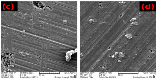 Figure 5 shows the SEM image of uncorroded aluminum, corroded aluminum in the absence of inhibitors and corroded aluminum in the presence of inhibitors. Earlier work [55] used SEM to characterize the heterogeneous nature of aluminum surface, revealing the microstructure propeties of the metal surface. Rosa and co-workers [56] reported the correlation between surface structure and corrosion resistance and their findings are supported by the work of Osorio and co-workers [57]. To this end therefore, the heterogeneity of the uncorroded metal surface adsorption sites is revealed in the SEM image presented in Figure 5a. Figure 5b reveals that after immersion in hydrochloric acid in the absence of inhibitor, the metal surface becomes corroded badly due to the attack of chloride ion. The formation of a white colored “flower-like” substance thought to be from the corrosion resistant aluminum oxide film, failed to protect the metal from the attack of chloride ion which agrees with an earlier report [58]. The corrosion attack on the metal surface decreased markedly in the presence of BTThio, Figure 5c, a strong indication that BTThio presence protected the metal surface from Cl− attacks effectively, hence, its use for aluminum corrosion inhibition is encouraged. In the presence of ClGaBTThioPc, shown in Figure 5d, the metal surface was effectively protected in the presence of the inhibitor, showing marked improvement over BTThio protection performance at the same inhibitor concentration.