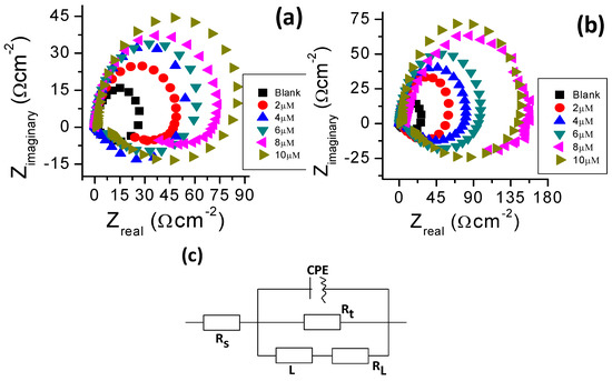 The capacitive curves are often attributed to the charge transfer of the corrosion process. Figure 7a,b show the Nyquist plots that have depressed semicircle characteristic of capacitive curves explained to be caused by the dispersion effect from surface irregularities and heterogeneities [43]. The inductive curves at low frequency values are thought to be caused by the relaxation process when species such as or inhibitor species adsorb on the electrode surface [42]. The inductive curve in Nyquist plots (Figure 7) therefore may be closely related to the existence of a passive film on aluminum [44]. Inductive curves seen in the presence of the inhibitors are larger than in their absence, suggesting a significant role of inhibitor species adsorption onto aluminum.