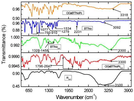 This FTIR spectra of studied inhibitors (BTThio and ClGaBTThioPc), corroded aluminum in the absence and presence of the inhibitors are shown in Figure 8. Vibrational peak around 3100 cm−1 seen in the infrared spectrum for corroded aluminum (labelled as Alcorr in Figure 8) can be ascribed to the signals of aluminum hydroxide Al(OH)3, AlOOH and hydrated aluminum (Al-H2O) [46]. This indicates that metal surface composed of oxides of aluminum that form a protective thin film. Interestingly the infrared spectrum of corroded aluminum in the presence of BTThio (labelled as BTThiocorr) shows a reduction in the intensity of the peak at 3100 cm−1 (shifted to 3300 cm−1), Figure 8. In a similar manner, the infrared spectrum of corroded aluminum in the presence of ClGaBTThioPc shows a further decrease in the intensity of the peak at 3100 cm−1 (shifted to 3300 cm−1), and this provides evidence of improved metal corrosion retardation than BTThio.