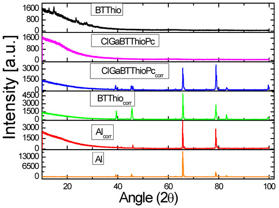 The XRD patterns of the uncorroded aluminum surface, corroded aluminum surfaces in 1.0 M hydrochloric acid in the absence and presence of BTThio or ClGaBTThioPc are presented in Figure 9. Uncorroded aluminum shows peak patterns at about 2θ = 39.3, 45.5, 65.8, 78.8 and 83.1°. These peaks correspond to aluminum signals of gibbsite [γ-Al(OH)3], bayerite [α-Al(OH)3], alumina (Al2O3), boehmite (AlOOH) and metastable alumina (χ-Al(OH)3 and κ-Al(OH)3) [59,60,61,62]. These diffraction peaks are indexed as orthorhombic phase of boehmite AlOOH (JCPDS number 00-021-1307) for 2θ = 39.3 and 65.8°, as cubic γ-Al2O3 (JCPDS number 00-001-1303) for 2θ = 45.5° and as face centered cubic aluminum (JCPDS number 004-0787) for 2θ = 65.8 and 78.8°. On comparison with diffraction peaks of metallic aluminum, peaks at 2θ = 39.3, 45.5, 65.8, 78.8 and 83.1° match well (JCPDS number 89-4037) [63,64,65,66,67].