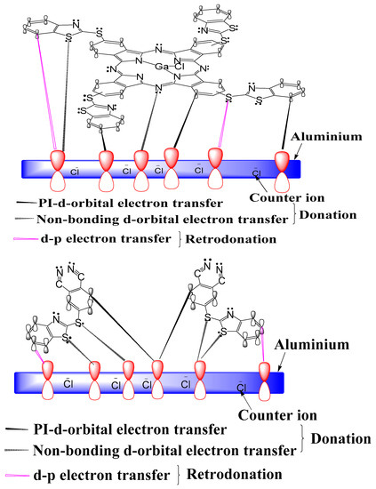 Equations describing the general mechanism for the dissolution of aluminum have been reported [72]. Adsorption of inhibitor molecules consequently leads to retardation of metal corrosion by blocking the formation of AlOHads species available for the rate determining steps of the oxidation reaction and the complexation of chloride ions. As earlier reported by Obi-Egbedi and Obot [73], in the presence of inhibitors (TThio or ClGaBTThioPc), adsorption onto the metal surface is generally believed to occur, as proposed in Figure 11, protecting the metal from the aggressive attack of Cl−.