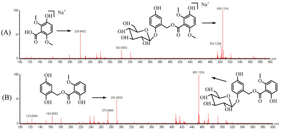 M3 (C9H10O5), with a retention time of 6.27 min, showed a protonated [M + Na]+ ion at m/z 221.0415, 261 Da lower than that of CC. In addition, the MS fragmentation patterns were analogous to those of the reference substance 3-hydroxy-2,6-dimethoxybenzoic acid, with characteristic fragment ions at m/z 181.0536, 123.0056, 167.9961, 170.0025. The fragment ion at m/z 181.0536 was produced by the cleavage of the C7′-OH bond. The ion at m/z 167.9961 was attributed to the loss of two methyl residues. By the cleavage of C2′-O bond (losing a methoxyl residue) and C1′-C7′, the fragment ion at m/z 123.0056 was produced. Hence, M3 was identified as 3-hydroxy-2,6-dimethoxybenzoic acid, the hydrolysis metabolite of CC.