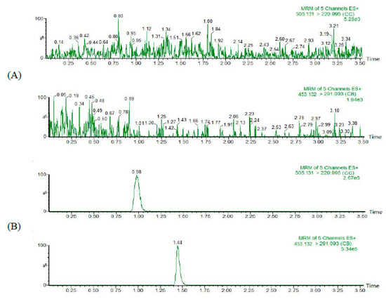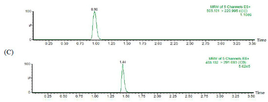 It is known that the pharmacokinetic parameters are necessary for the evaluation of active ingredients [19,20]. To the best of our knowledge, there are no reports on pharmacokinetic assays of CC. In the present research, CC was used for pharmacokinetic and metabolism studies. Due to the high sensitivity and rapid quantification [21,22], an ultra-high performance liquid chromatography combined with tandem quadrupole mass spectrometry (UPLC-MS/MS) method was developed and validated for the determination of CC in rat plasma. This method was then applied to pharmacokinetic study of CC in rats. In addition, the metabolic characteristics of CC were also studied to elucidate the dynamic process of CC in rats. The aims were to investigate the pharmacokinetics and metabolic characteristics of CC with a hydroxyl group at C-3′. In summary, this exploration provides a sensitive quantitative assay method and illustrated the pharmacokinetic characteristics of CC in rats.
